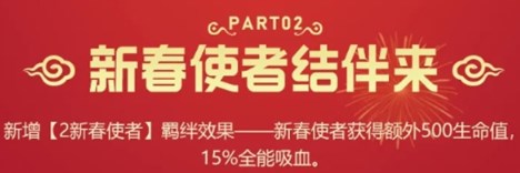 ,金铲铲之战2新春使者羁绊上场效果一览,一、羁绊效果解析,在激活“2新春使者”羁绊后,场上的新春使者单位将获得以下增益效果:,额外生命值:增加500点生命值,大幅提升坦度与生存能力。,全能吸血:获得15%的全能吸血效果,能够通过造成的伤害为自身回复生命值,提高续航能力。,