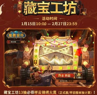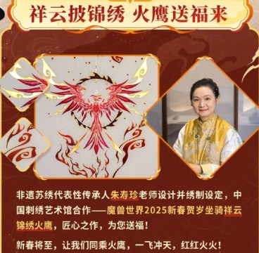 魔兽世界祥云锦绣火鹰如何获得?在魔兽世界中,最新的新春狂欢节活动为玩家们带来了一系列的全新活动,本次更新中带来了藏宝工坊的全新抽奖内容,在这次的藏宝工坊中,玩家们有机会抽取到和刺绣艺术馆合作的全新贺岁坐骑祥云锦绣火鹰,对于这个全新新坐骑有很多玩家都很期待,本次小编为大家介绍的就是获取祥云锦绣火鹰的具体方式,有兴趣了解的小伙伴们快来看看吧。,,魔兽世界祥云锦绣火鹰获取攻略,答:通过藏宝工坊抽奖获得。,详细介绍:,1、祥云锦绣火鹰是本次2025新春狂欢季提供的全新的坐骑,与中国刺绣馆合作设计。,,2、我们可以在1月15日10点上线的藏宝工坊中,通过抽奖的方式来获得这个坐骑。,3、在藏宝工坊的第13抽必定会获得祥云锦绣火鹰整个坐骑。,,注:正式服和怀旧服单独计算,4、对祥云锦绣火鹰这个坐骑感兴趣的小伙伴们,可以在藏宝工坊长先后进行抽奖来获取,不要错过了。