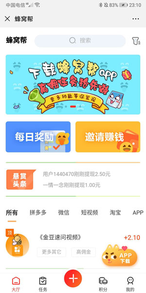 蜂窝帮,让您的闲暇时间变得更有价值。蜂窝帮APP是一款手机悬赏任务平台,悬赏、互助,帮人忙就能赚钱!用户在这里,不仅可以通过完成悬赏任务来赚佣金,还可以发布任务供其他用户完成。海量悬赏任务,让你的业余时间变得更有价值!